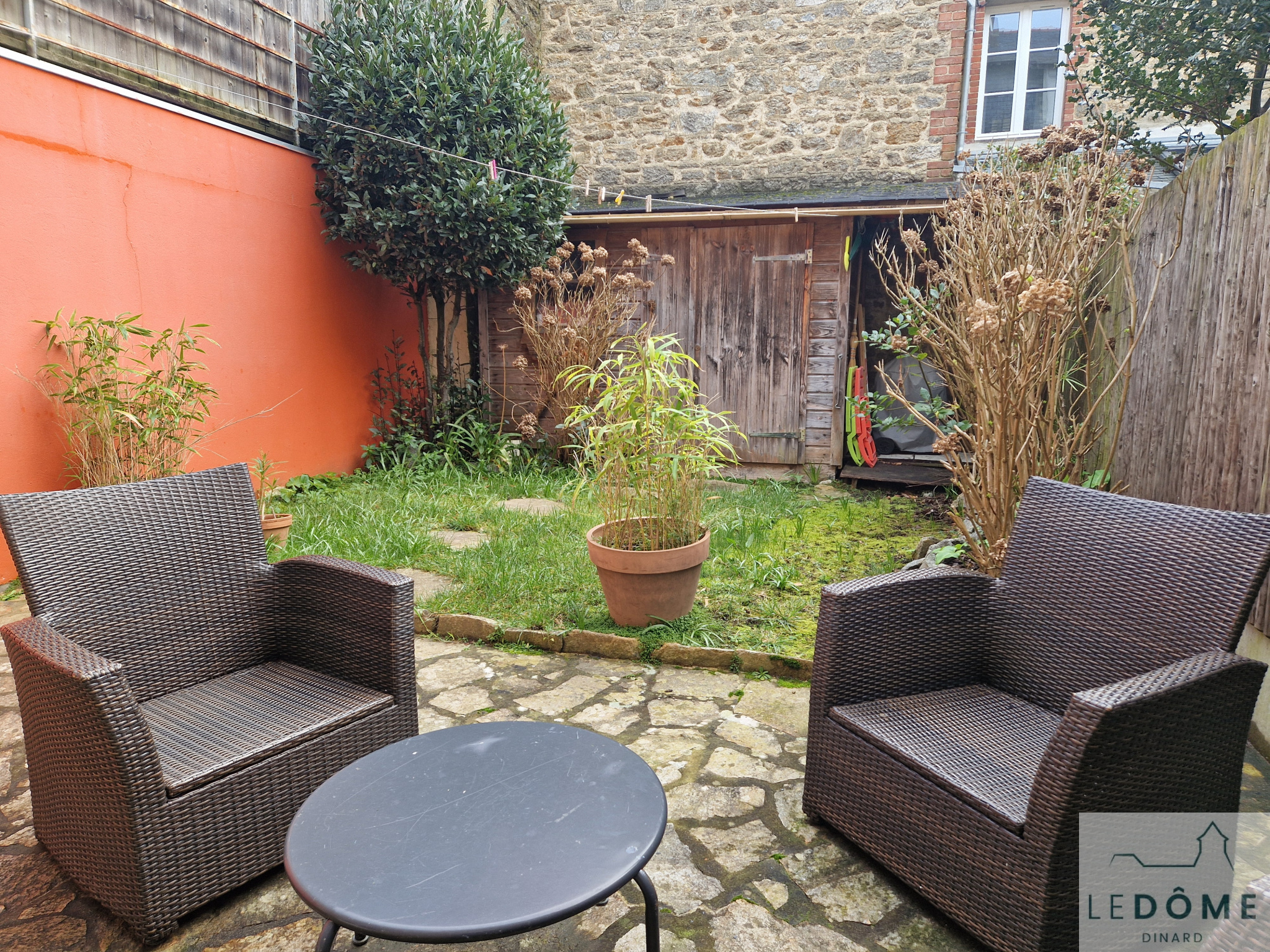 Au rez-de-chaussée une entrée avec WC mène à une pièce de vie lumineuse avec cuisine aménagée et équipée, le tout ouvrant sur une terrasse sud et un jardinet clos doté d'un cabanon de rangement.