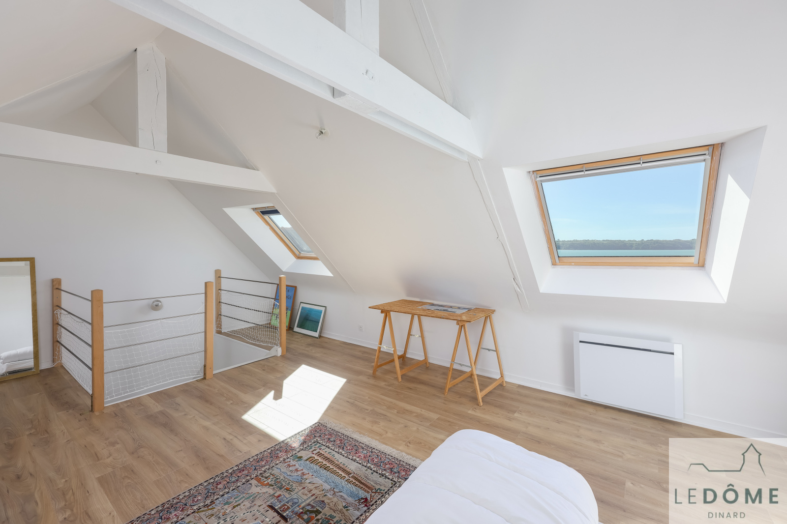 Le dernier étage, aménagée en grande chambre, est lumineux grâce à ses trois grands velux offrant une superbe vue panoramique.
